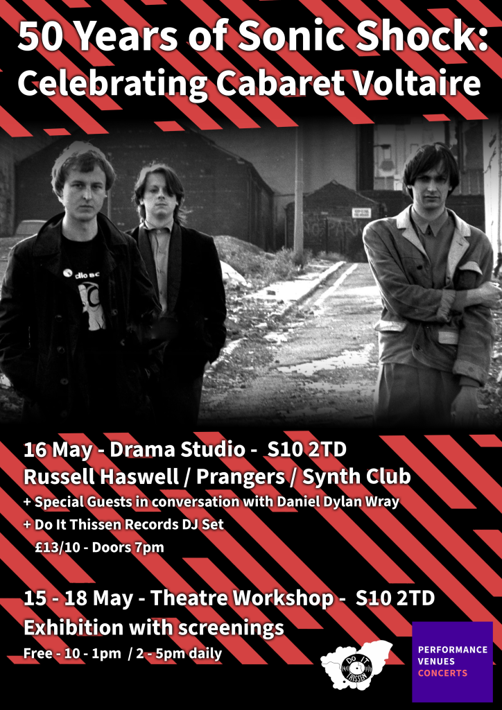 Encyclopaedia Electronica is delighted to be involved in developing these events to celebrate the 50th Anniversary of the first ever Cabaret Voltaire gig, at the Students Union, Sheffield University on 13th May 1975. A group of fans, working with Sheffield University, will present a 4 day exhibition of Cabaret Voltaire artefacts, alongside an evening of sonic shock by contemporary artists, much as the Cabs themselves provided a shock to the system back in 1975. Information and tickets for the gig (reasonably priced) and the exhibition (free but ticketed) are available at this link: