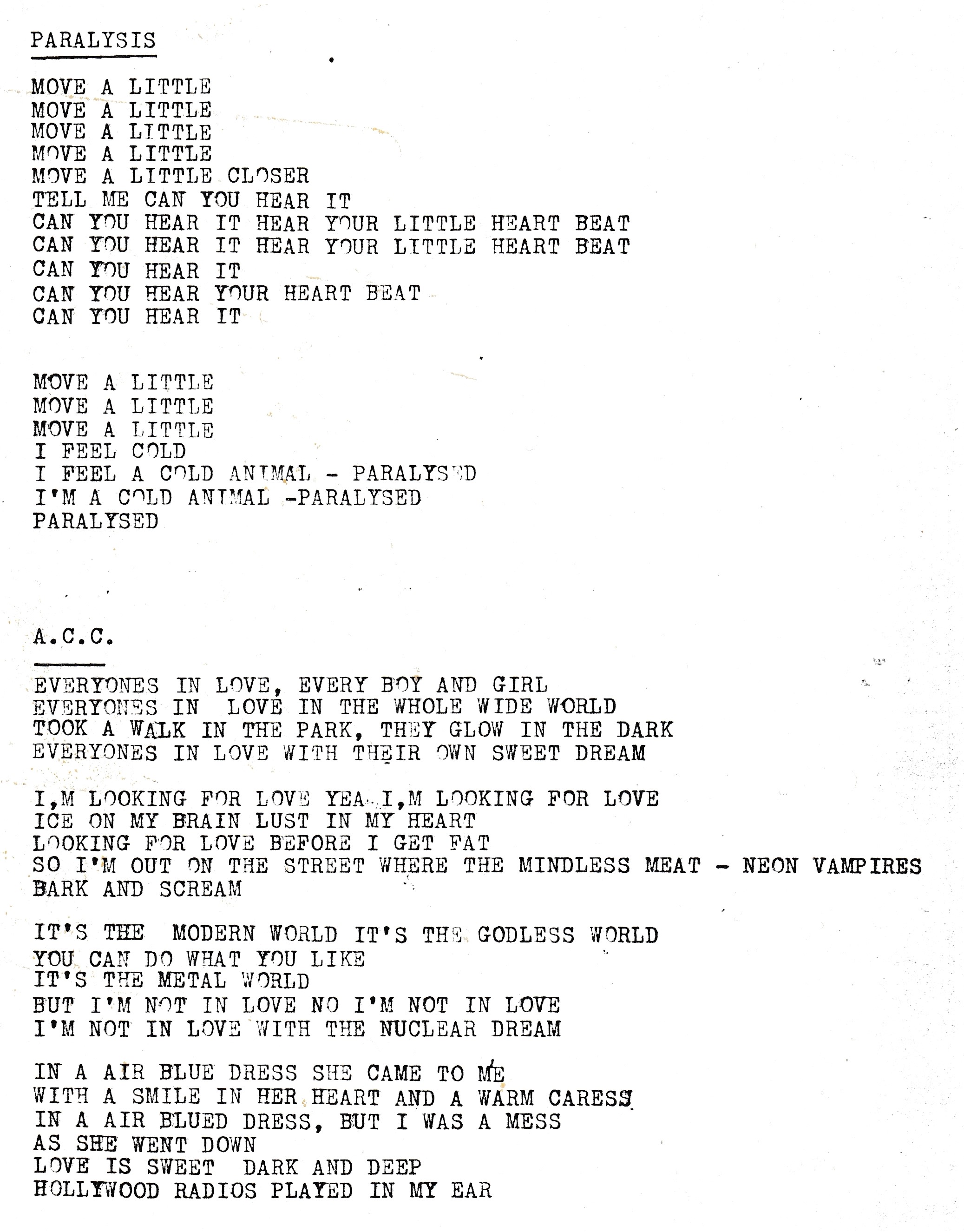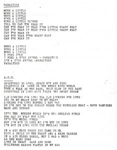RR: No, I’m afraid I don’t have a lyric sheet. All I can tell you is the lyrics to both songs come from the same piece of writing all cut up and stuff and represent about a quarter of the whole piece, most of which I have now lost.